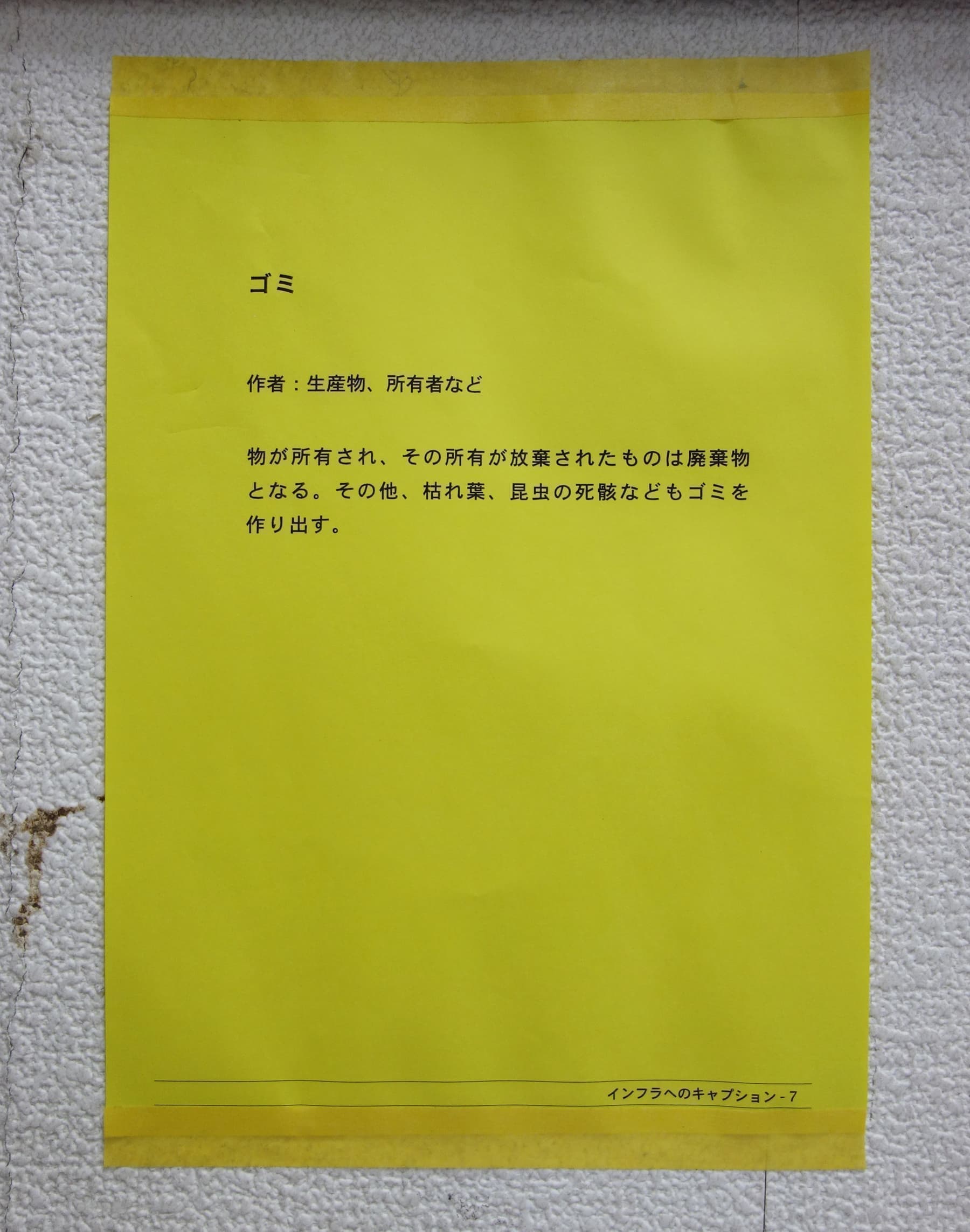 展覧会は、作品だけではなく普段は意識しない様々な要素によって成り立たっています。光源、建築、都市、地質、交通網、大気など、展覧会を成立させている様々なインフラ・ストラクチャー(下部構造)にキャプションを付け、対象化させます。