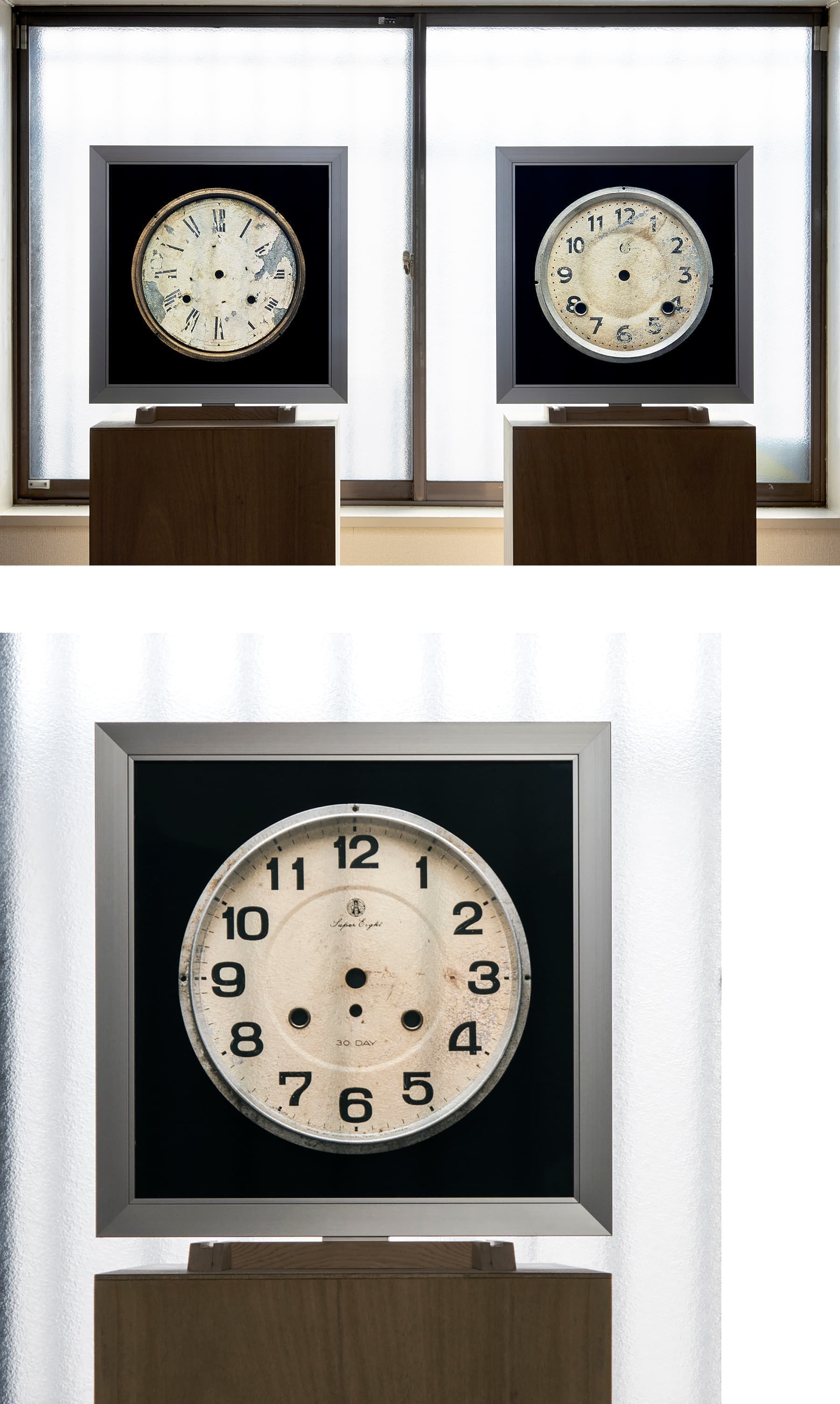 経年劣化による痕跡が現れた時計の文字盤の写真。時のレコードのようなこの写真を透過原稿フィルムにプリントし、会場となるビルの窓辺に設置した。