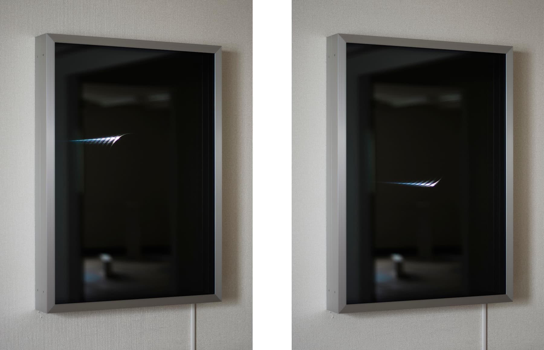 内部から現れる光の発光と移動は、プログラミングにより一秒ごとにリレーするように制御されており、作品のフレーム内はそのプログラミングによる光の推移と外部からの光の反射に満たされている。
