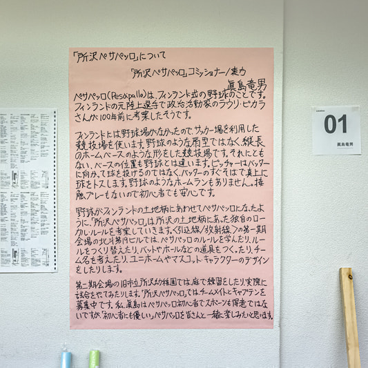 〈引込線/放射線〉の会期中に「ペサパッロ」(フィンランド式野球)のチームを結成します。第19北斗ビルではルールを学んだり、道具やユニフォームを作ったり、ロゴマークやマスコットをデザインしたり、その他なんでも思いついたことをやります(ホームグラウンドの旧市立所沢幼稚園では、練習や試合をします)。たぶん、誰もが初心者。コミッショナー(?)は〈引込線/放射線〉参加アーティストの眞島竜男。チームメイトとキャプテン募集中!