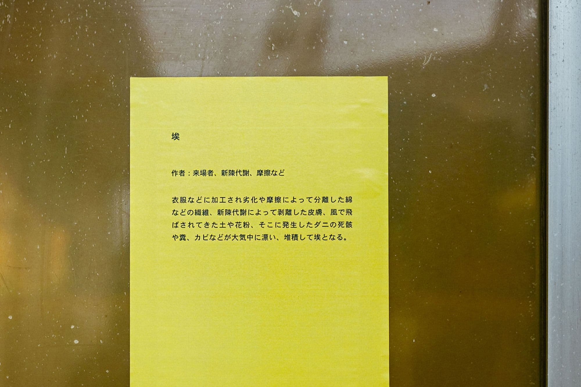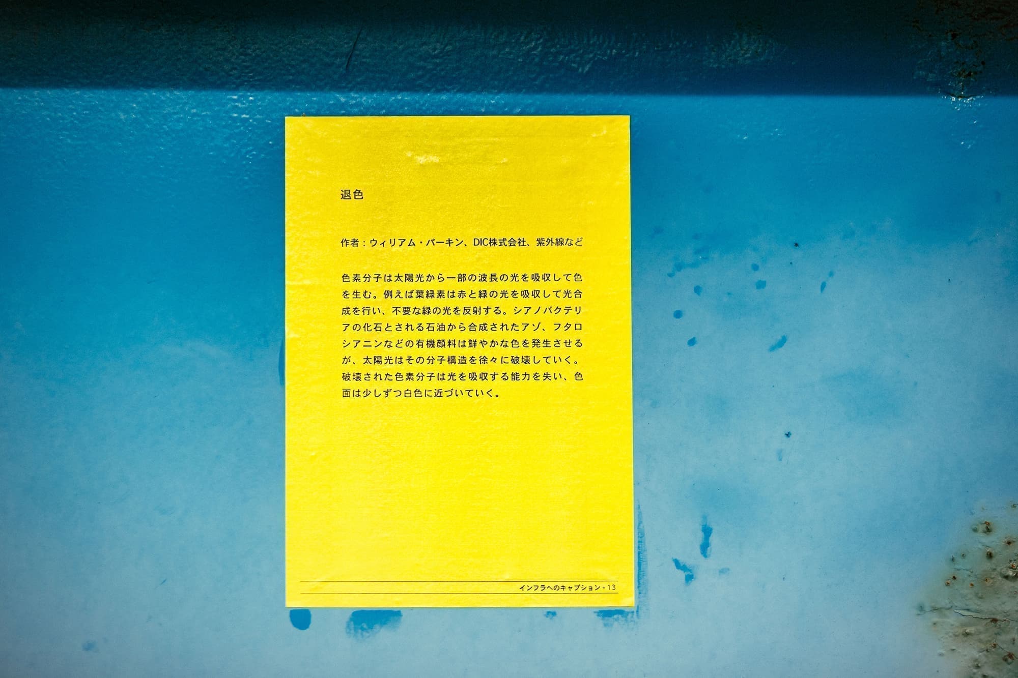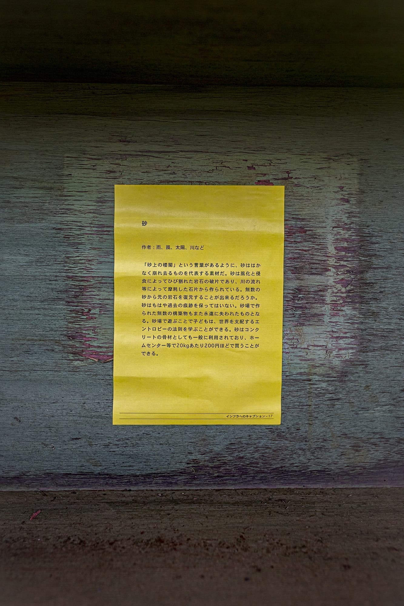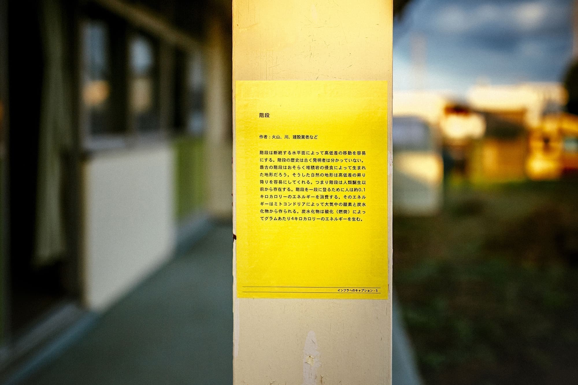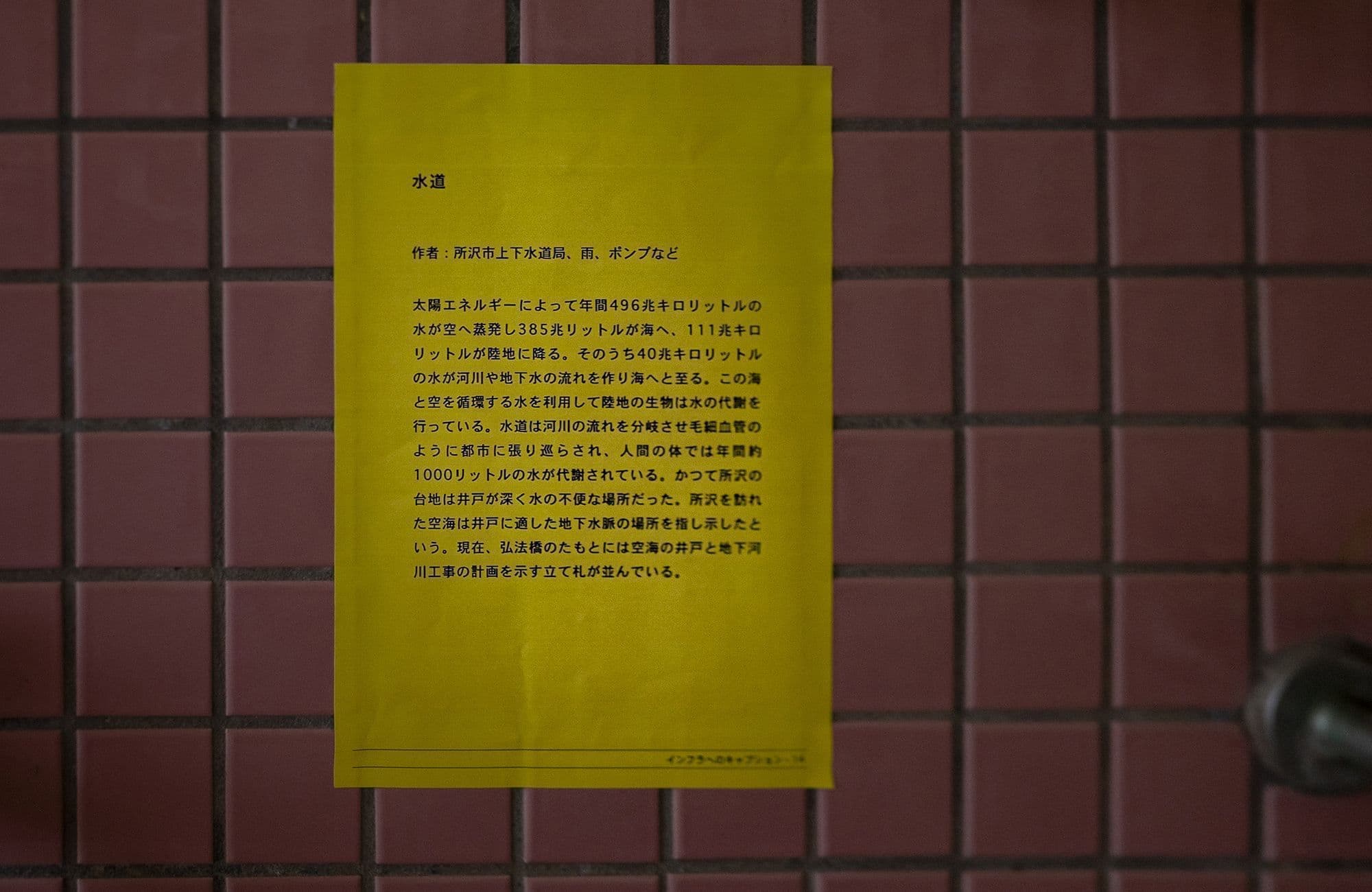 展覧会は、作品だけではなく普段は意識しない様々な要素によって成り立たっています。光源、建築、都市、地質、交通網、大気など、展覧会を成立させている様々なインフラ・ストラクチャー(下部構造)にキャプションを付け、対象化させます。