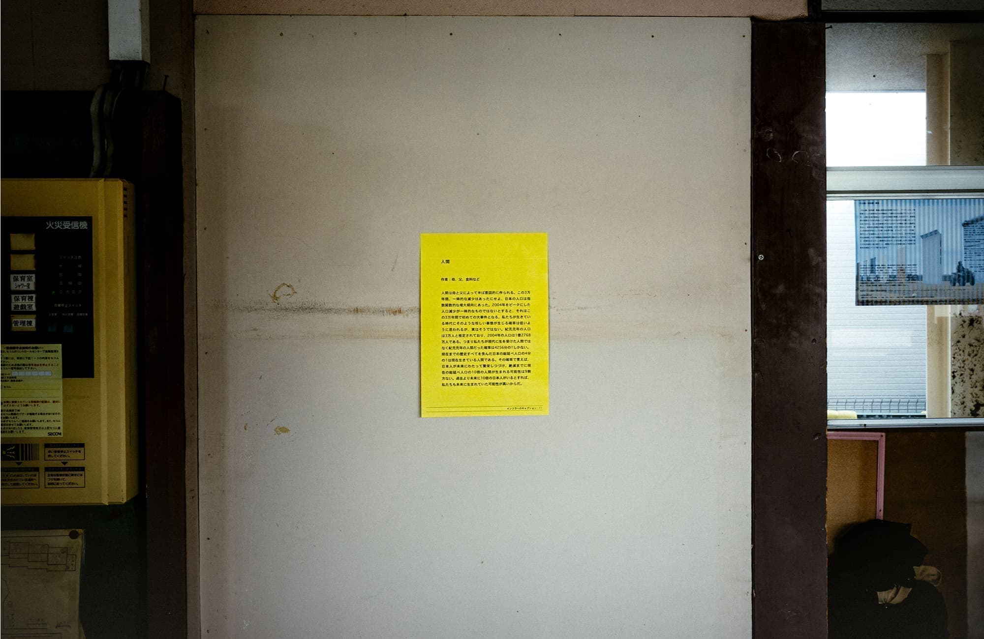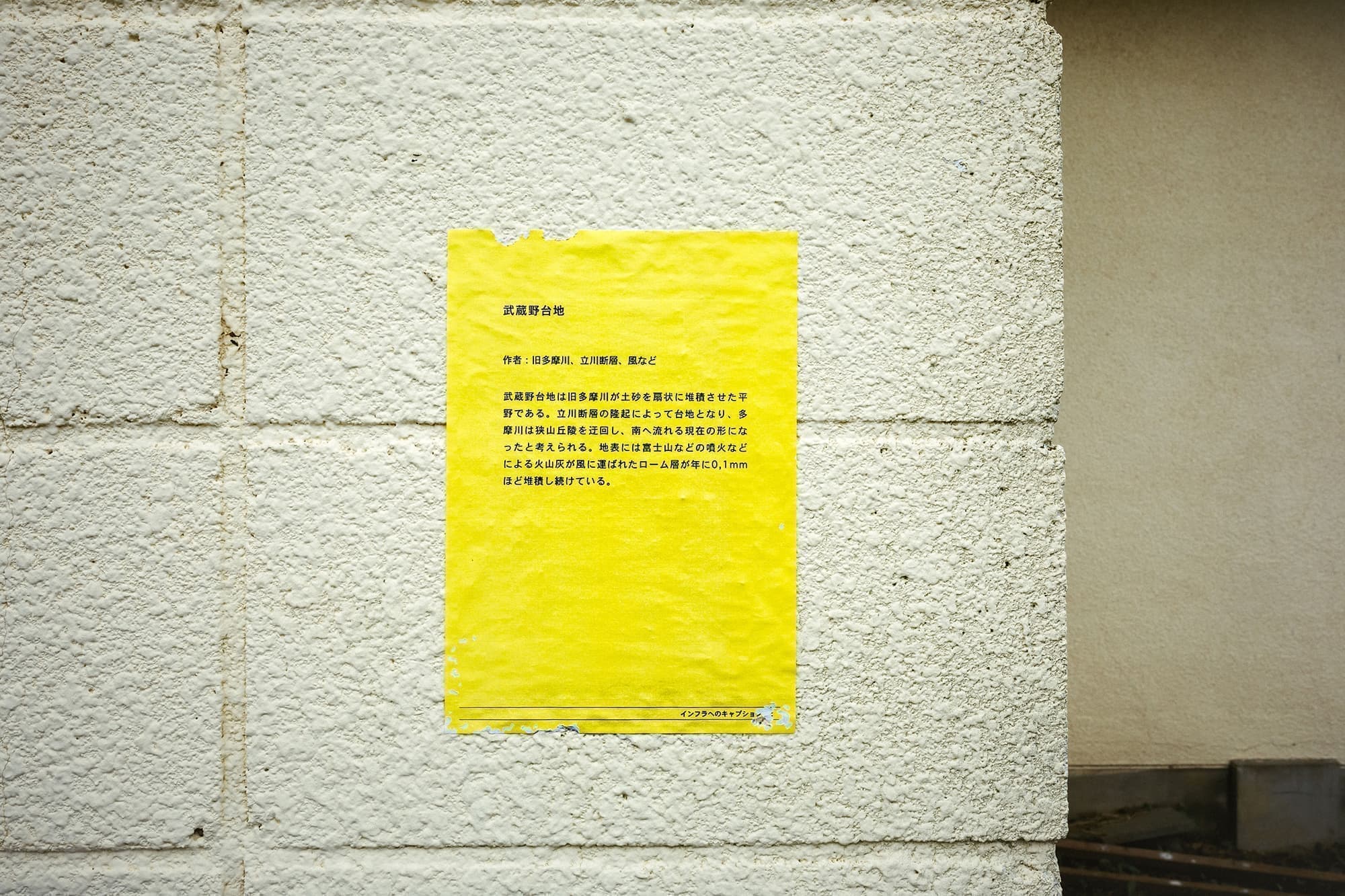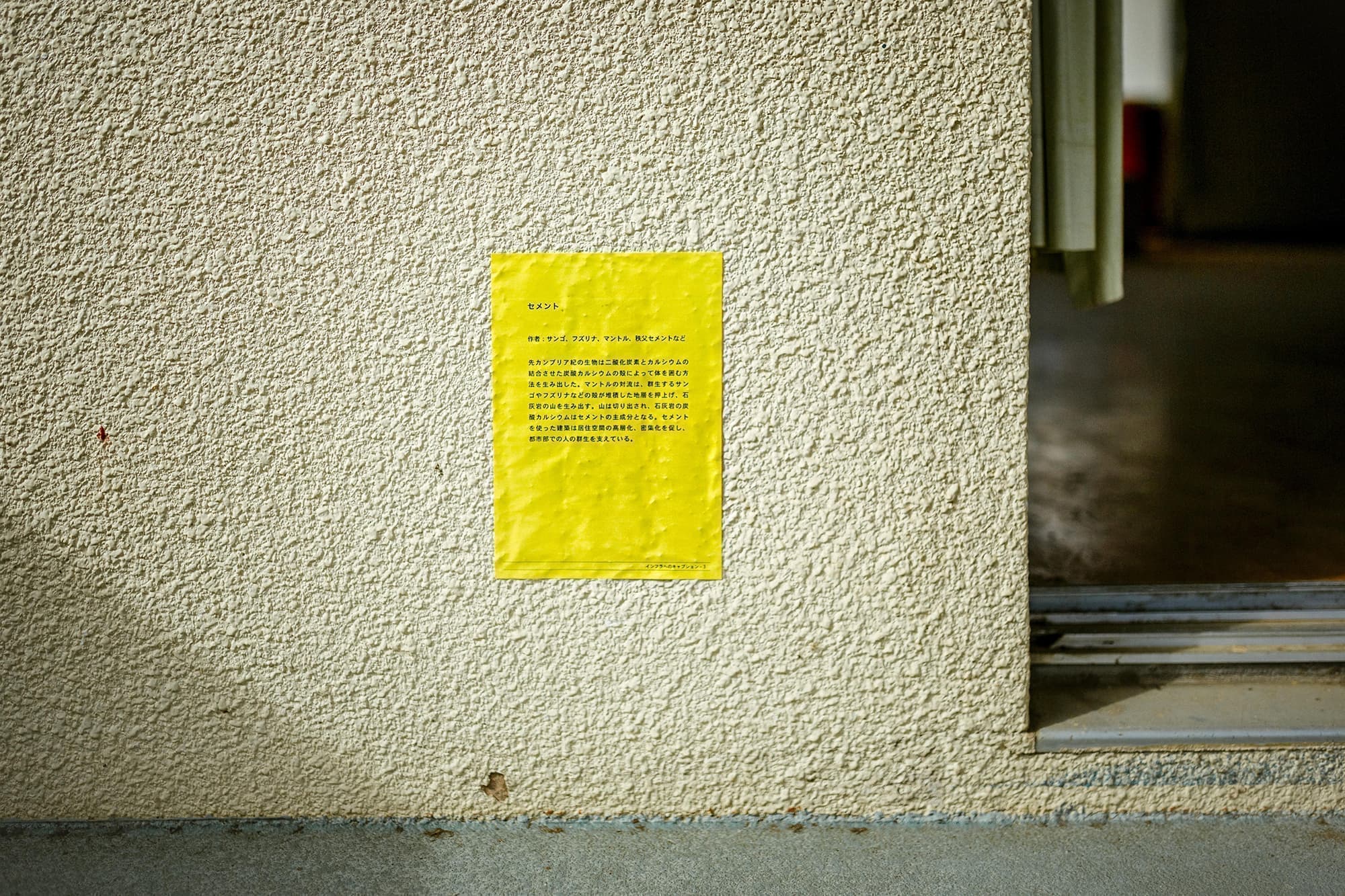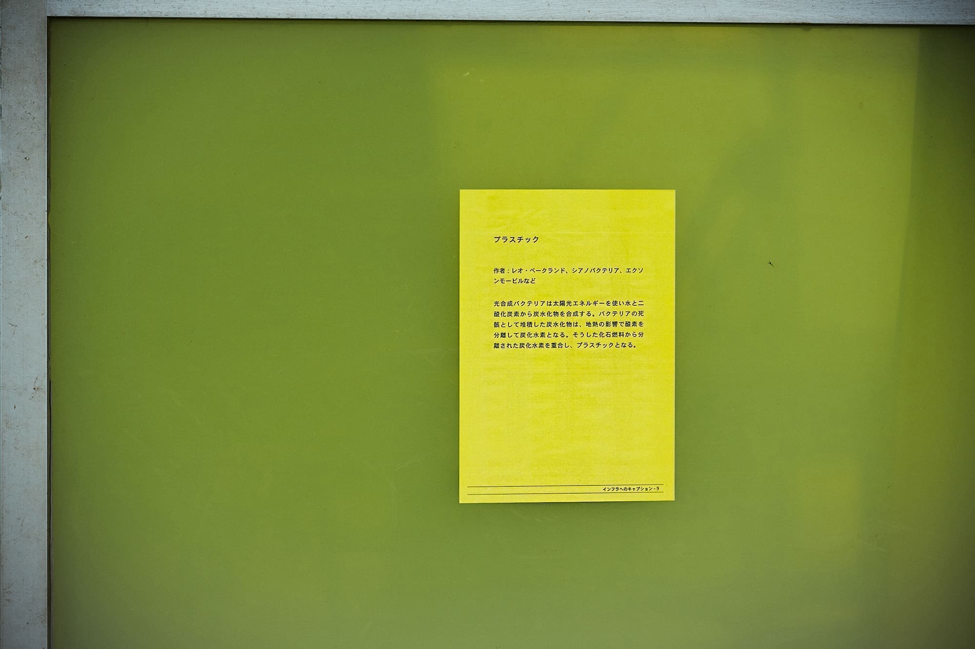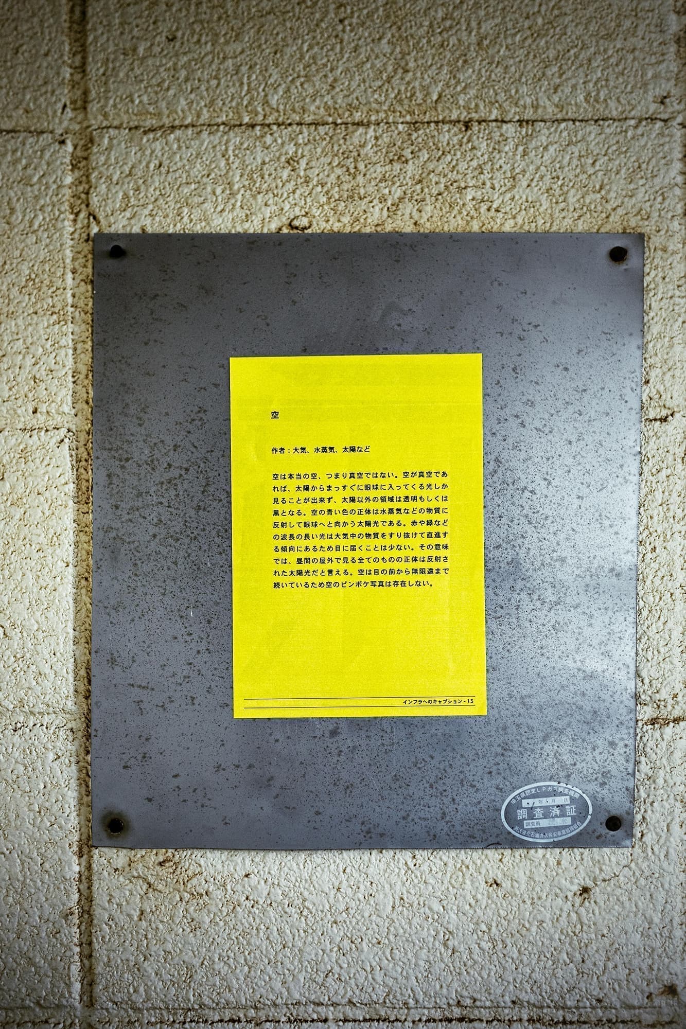 展覧会は、作品だけではなく普段は意識しない様々な要素によって成り立たっています。光源、建築、都市、地質、交通網、大気など、展覧会を成立させている様々なインフラ・ストラクチャー(下部構造)にキャプションを付け、対象化させます。