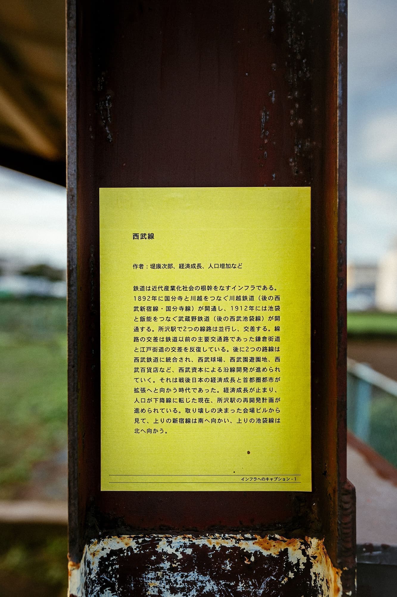 鉄道は近代産業化社会の根幹をなすインフラである。1892年に国分寺と川越をつなぐ川越鉄道(後の西武新宿線・国分寺線)が開通し、1912年には池袋と飯能をつなぐ武蔵野鉄道(後の西武池袋線)が開通する。所沢駅で2つの線路は並行し、交差する。2つの路線は西武鉄道に統合され、西武球場、西武園遊園地、西武百貨店など西武資本による沿線開発が進められていく。それは戦後日本の経済成長と首都圏都市が拡張していく時代であった。経済成長が止まり、人口が下降線に転じた現在、所沢駅の再開発計画が進められている。取り壊しの決まった会場ビルから見て、上りの新宿線は南へ向かい、上りの池袋線は北へ向かう。