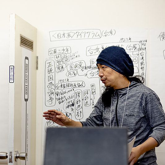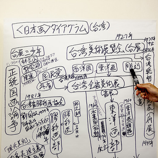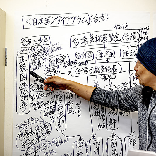 〈引込線/放射線〉参加アーティスト、眞島竜男によるレクチャー。1950年代の台湾画壇に起きた「正統国画論争」での「国画」「東洋画」「日本画」の関係について、「コンテンポラリー・アート」の視点から語ります。