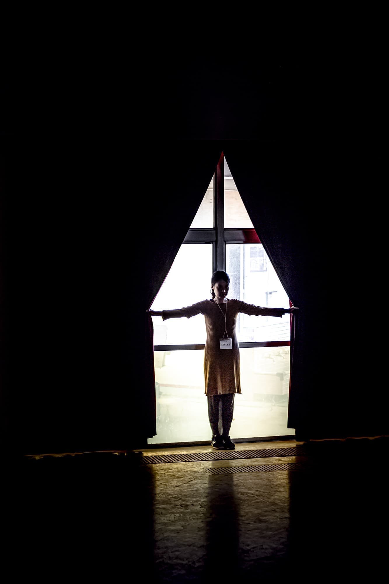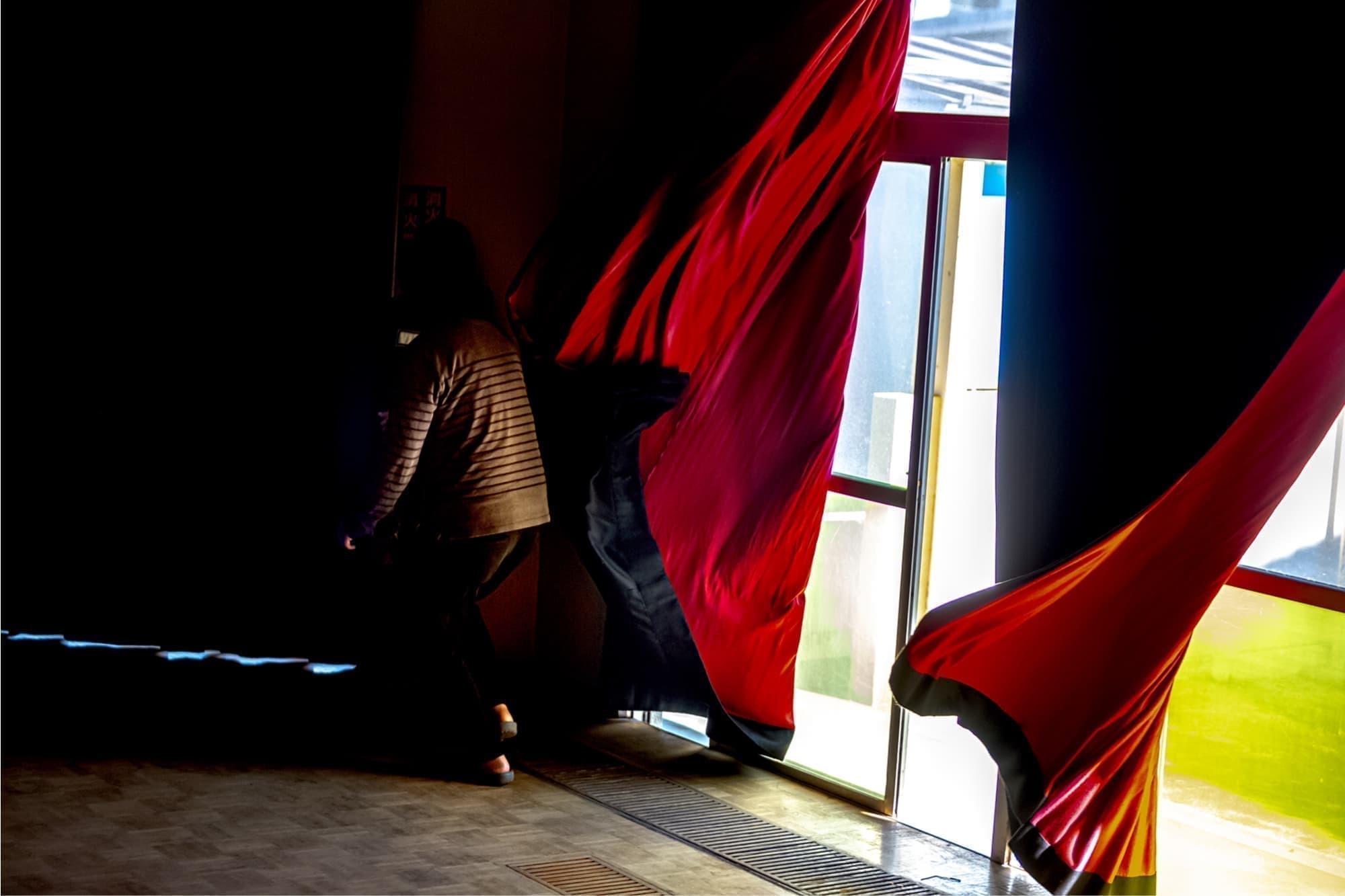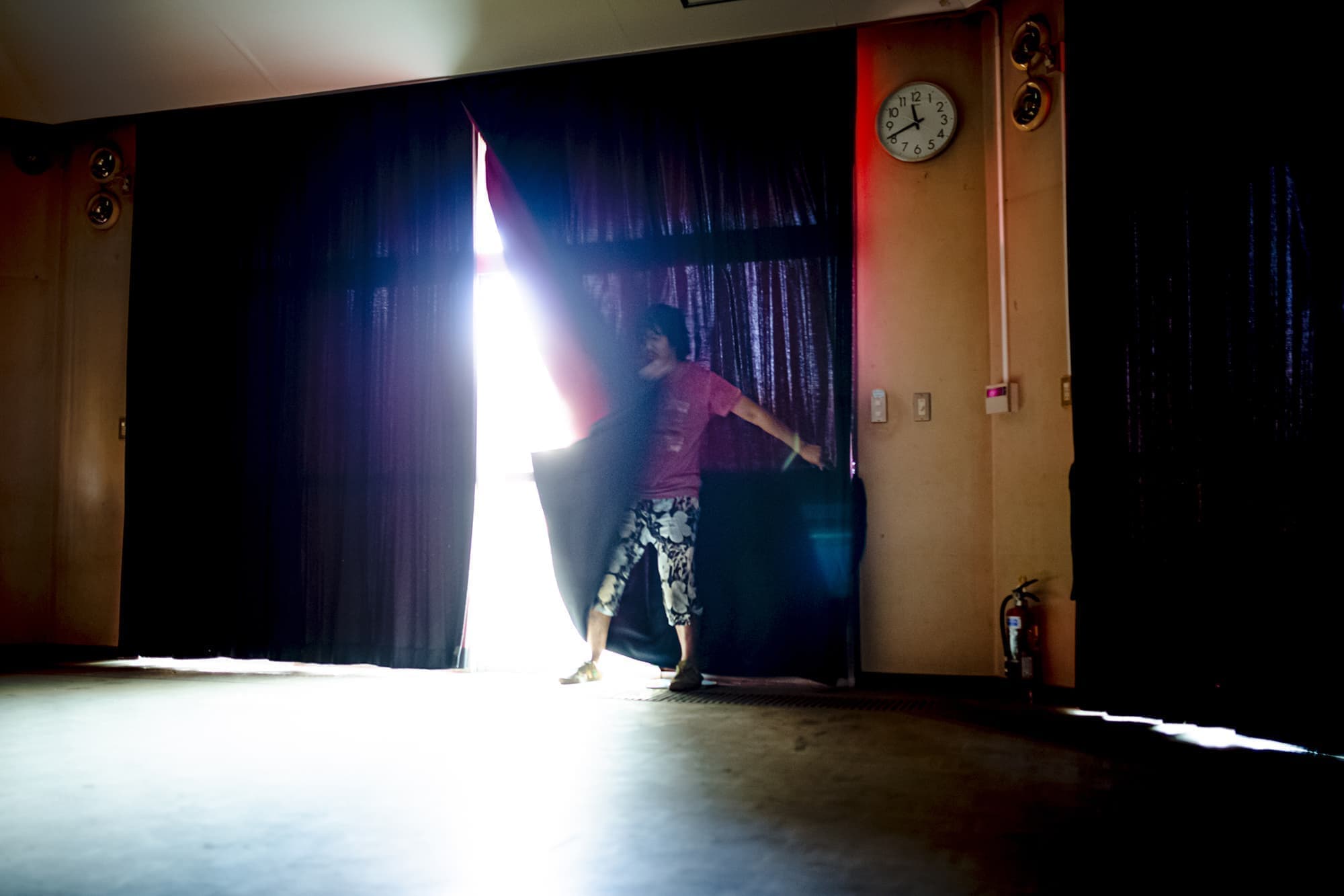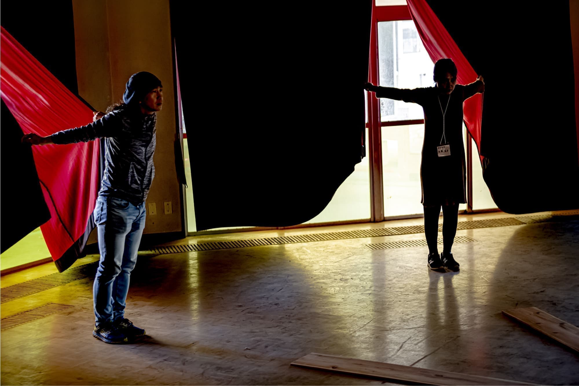この度「旧市立所沢幼稚園照明係」を組織し、電気の通わない旧幼稚園会場の講堂にて、暗幕カーテンを使った採光パフォーマンスを上映します。