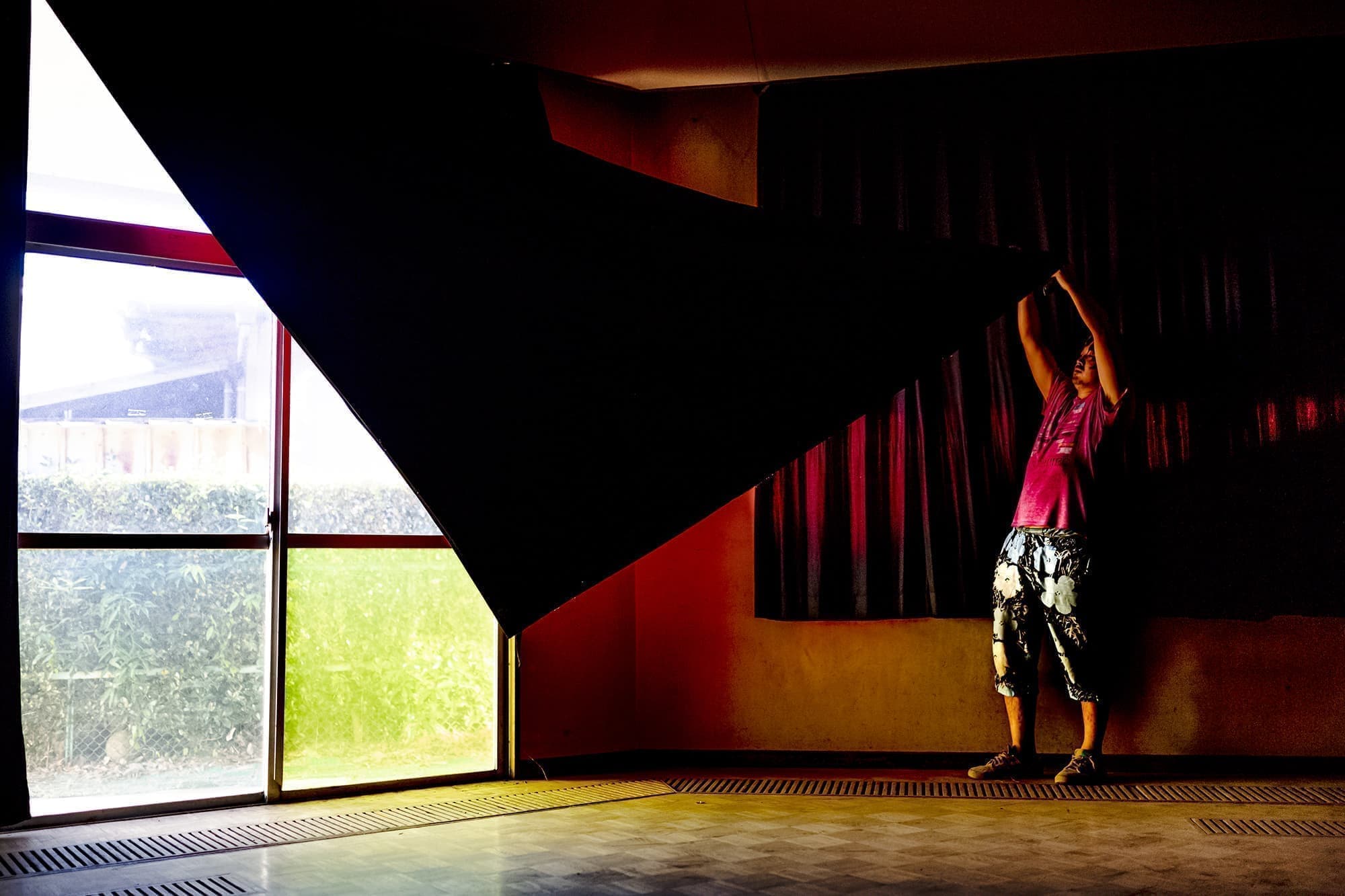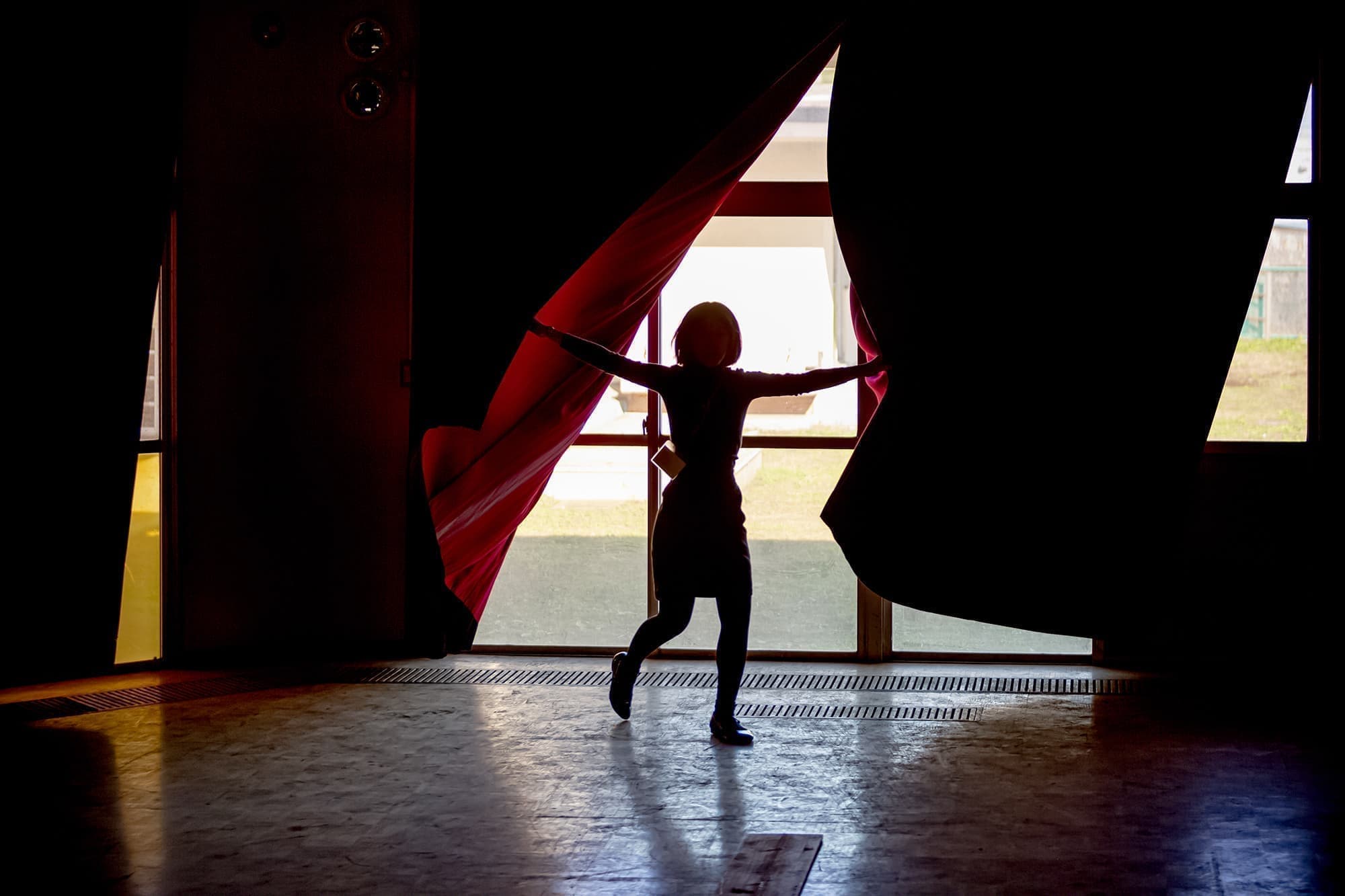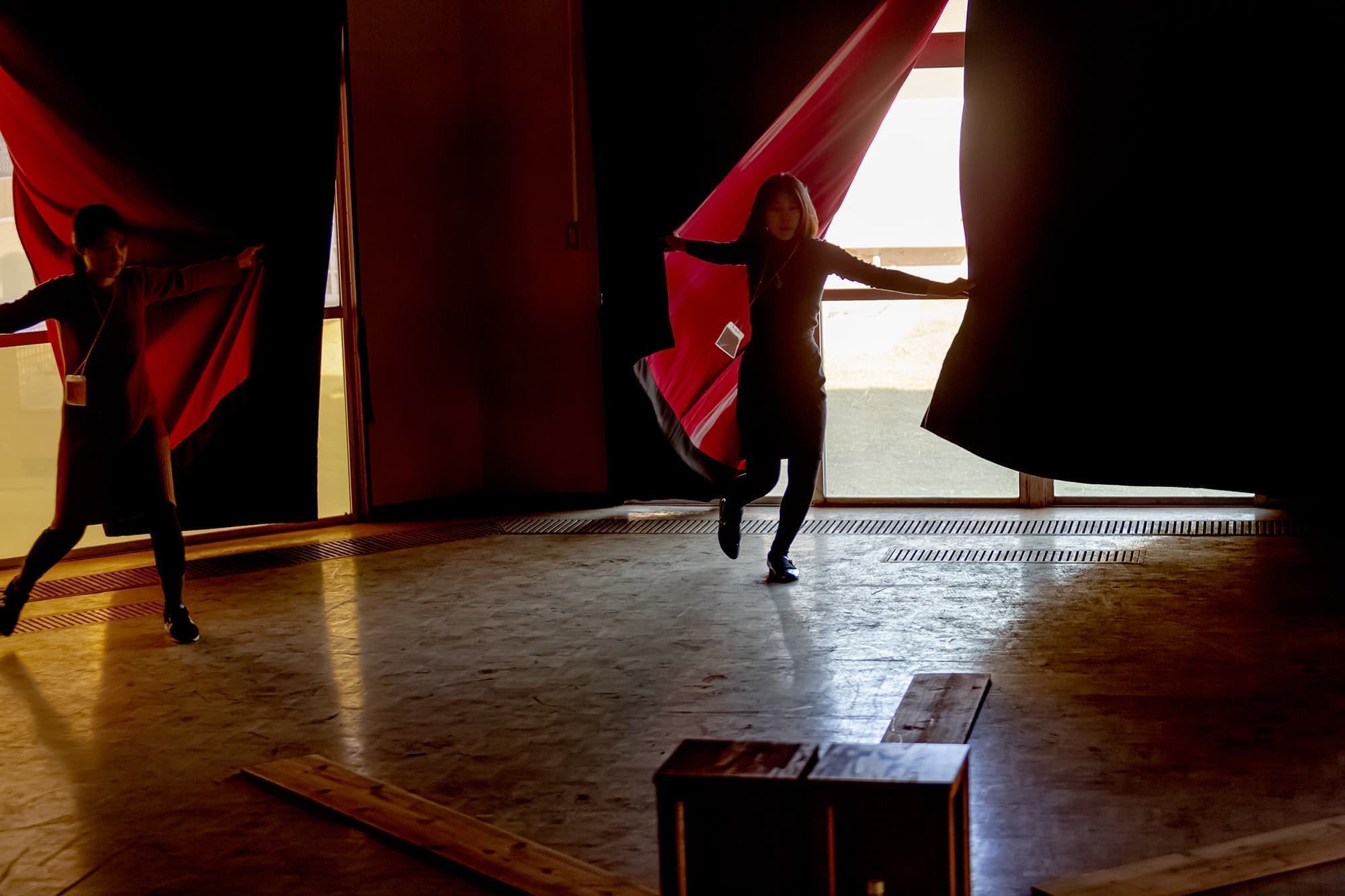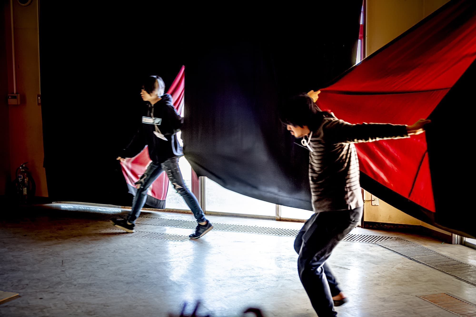 この度「旧市立所沢幼稚園照明係」を組織し、電気の通わない旧幼稚園会場の講堂にて、暗幕カーテンを使った採光パフォーマンスを上映します。