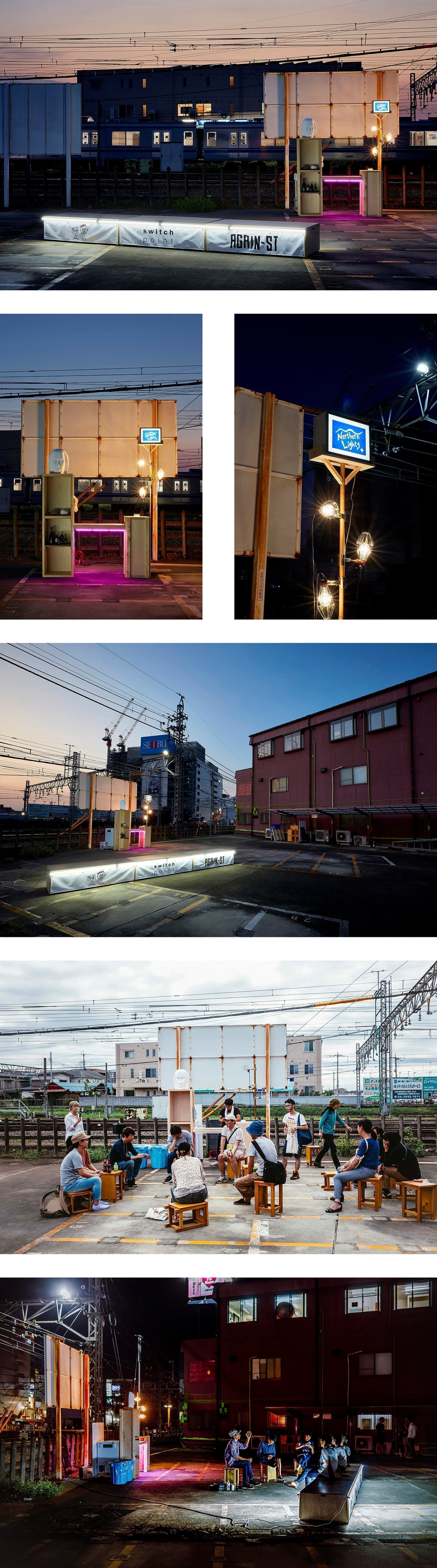 お客さまには、この割り切れない場所で、この場所の景色の一部にもなりながら、青空とビル壁と住宅展示場、そして電車の音を肴に寛いで頂けると幸いである。