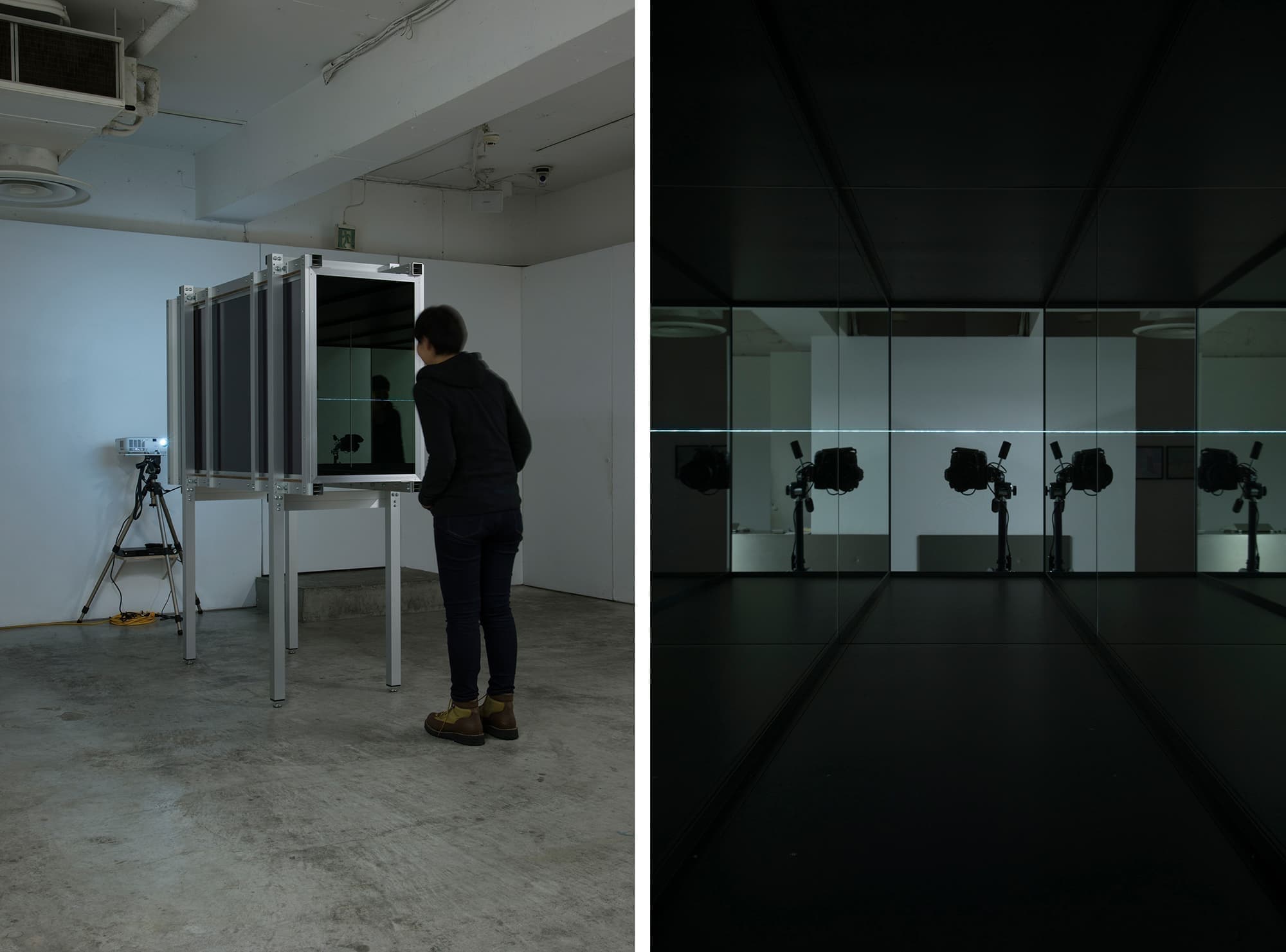鏡、アルミニュームフレーム、プロジェクター、DVDプレーヤー、映像10分ループ再生