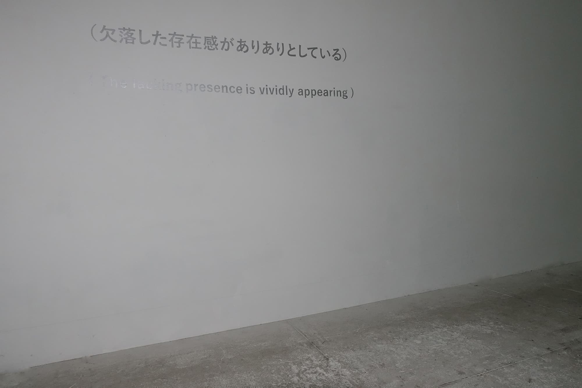 テキストによるインスタレーション作品(銀色のラッカースプレーによる建物へのステンシ ル) 引用:おさないひかり『わたしの虹色の手足、わたしの虹色の楽器』(個人出版)、岡崎乾 二郎監修『トリシャ・ブラウンー思考というモーション』(ときのわすれもの)